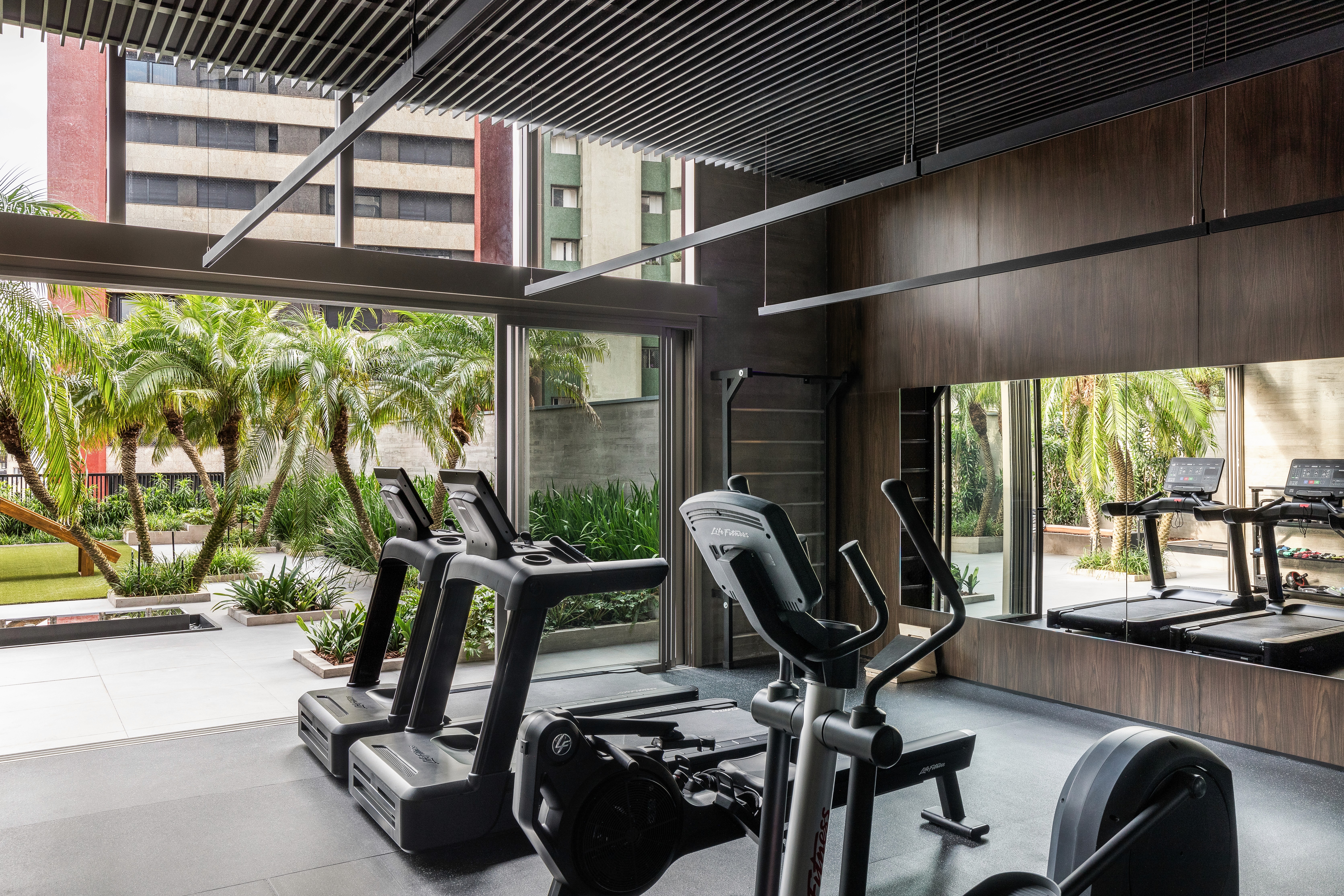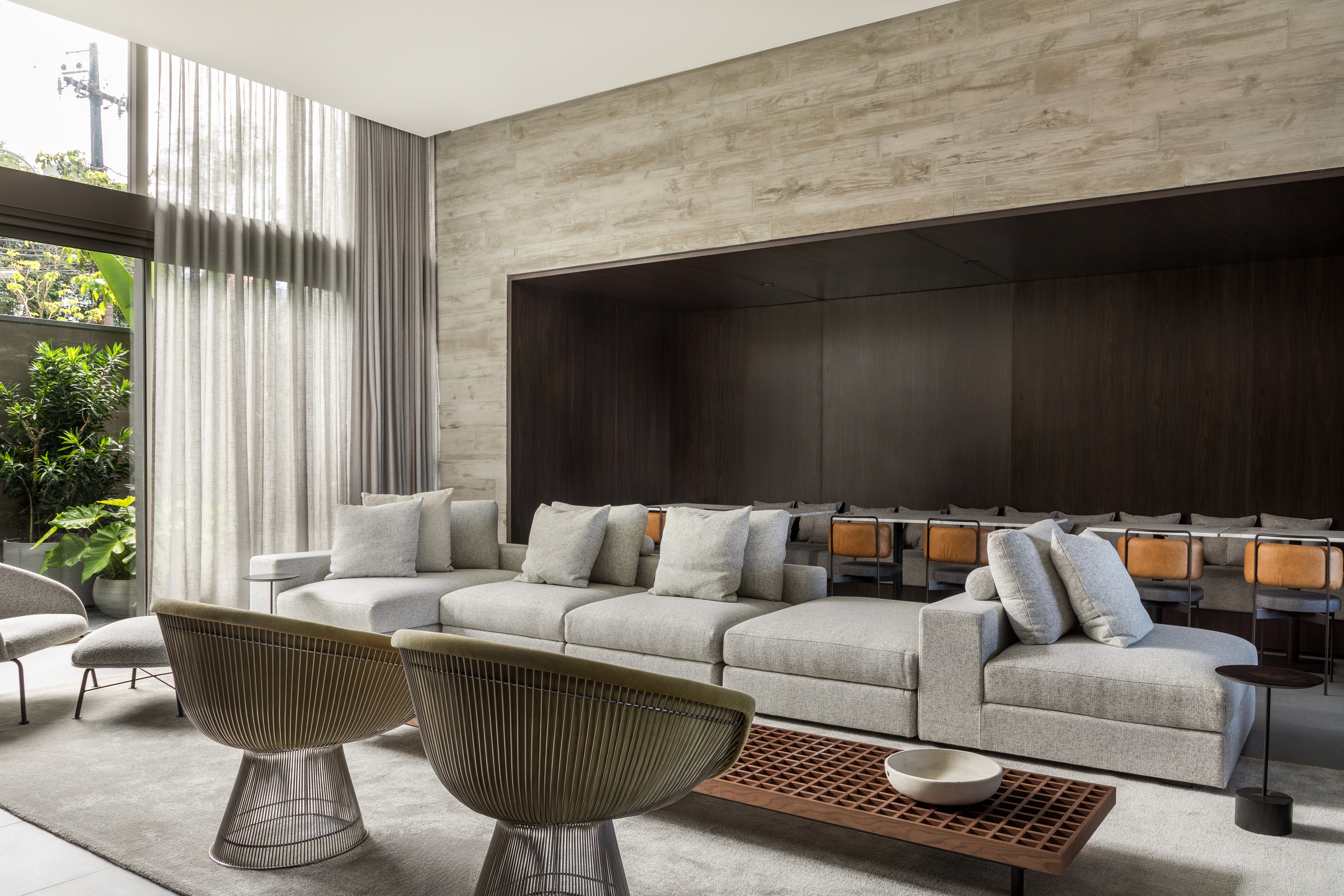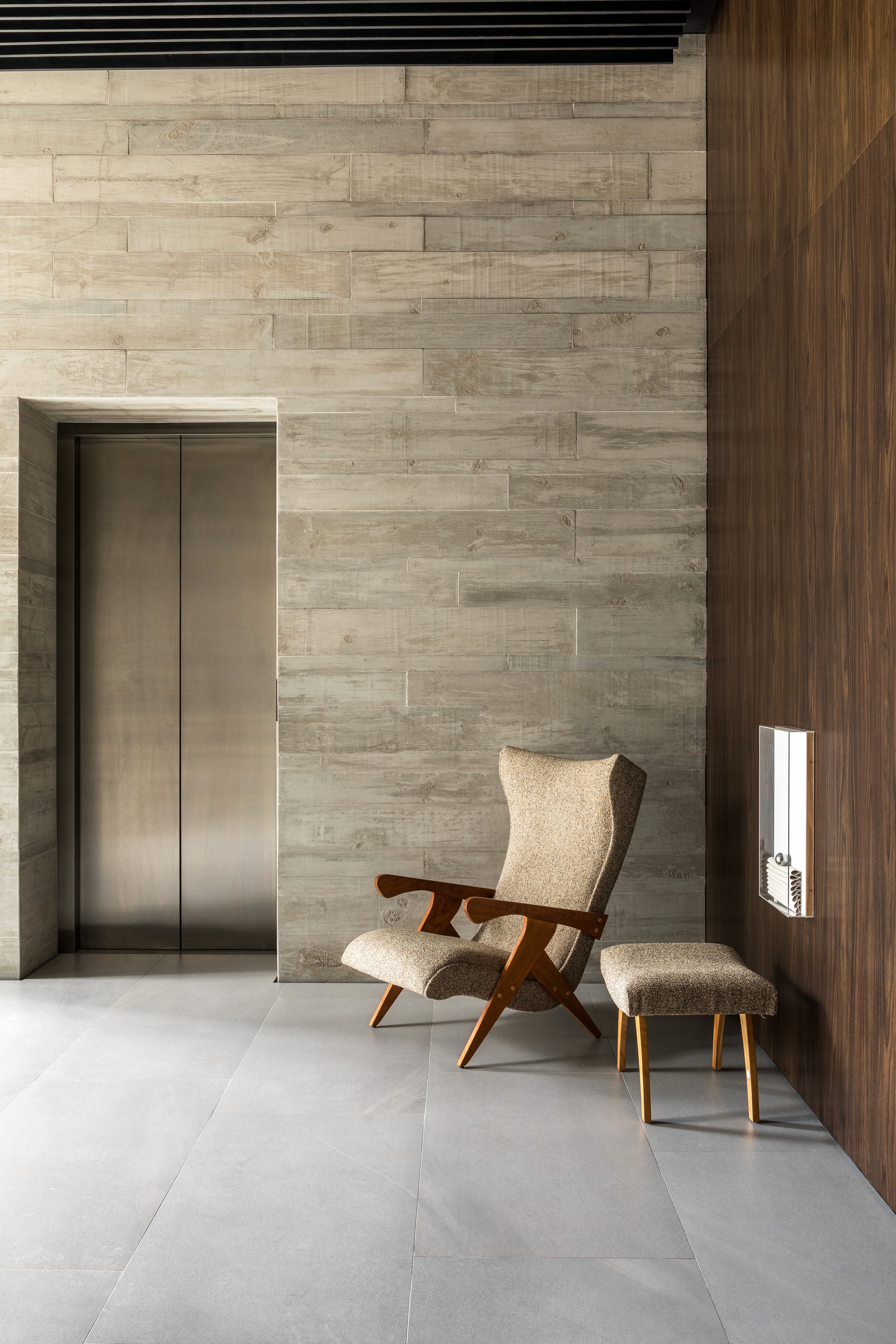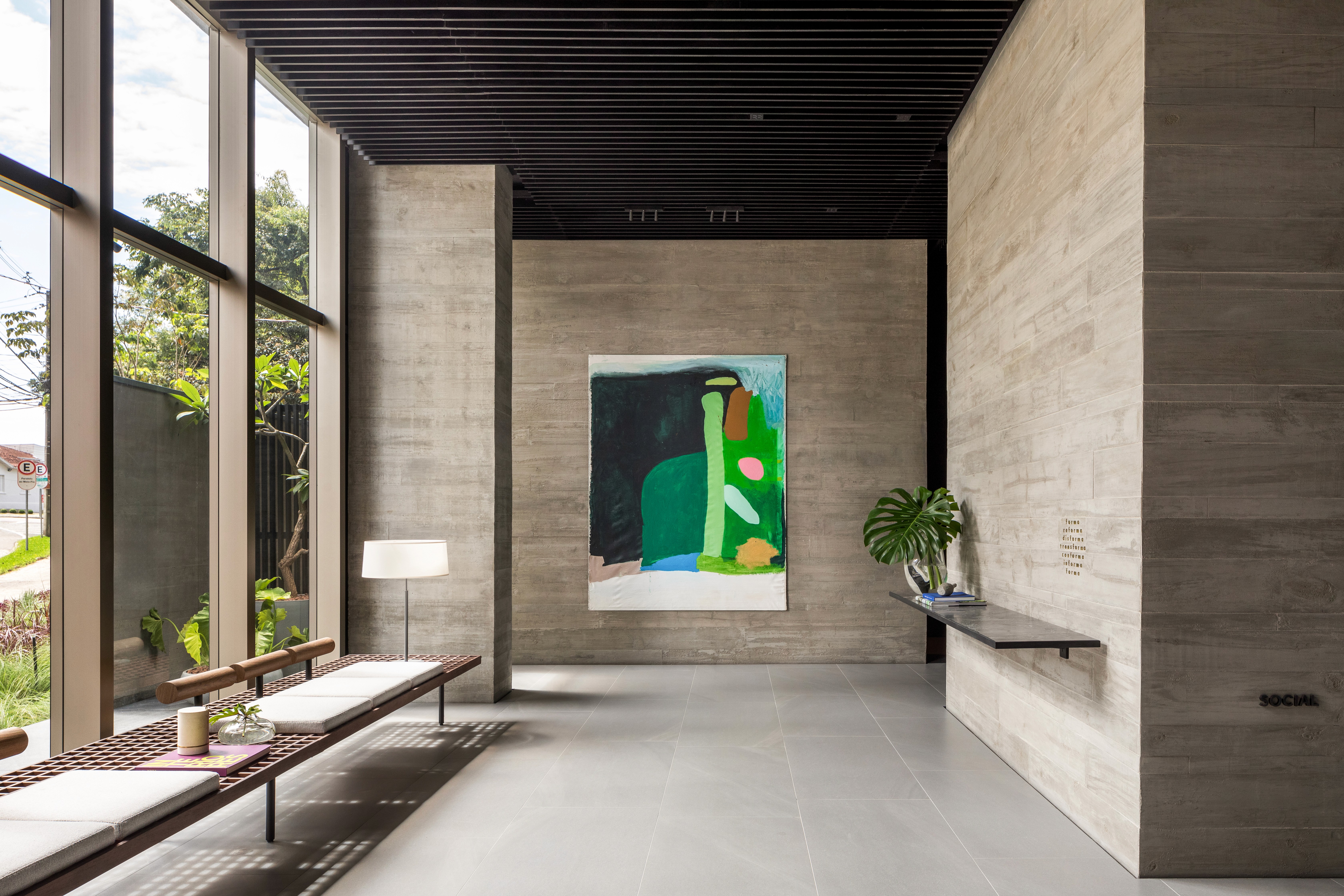As áreas comuns do edifício FORMA traduzem sofisticação e modernidade por meio de uma composição equilibrada entre materiais brutos e elementos refinados. A estética contemporânea é marcada pelo concreto aparente, que contrasta com a madeira escura, criando uma atmosfera acolhedora e elegante. A paleta neutra, composta por tons de cinza, madeira escura e mármore, é complementada por texturas e linhas minimalistas. O hall do FORMA não é apenas um ponto de passagem, mas uma experiência visual e sensorial que reflete a identidade contemporânea do edifício, combinando funcionalidade, design e arte em perfeita harmonia. Logo no acesso de entrada, a grande obra da artista plástica Eleonora Gomes, quebra a sobriedade do concreto e adiciona um toque de cor e expressão ao espaço. O banco de estrutura vazada, desenhada pelo nosso escritório especialmente para este espaço, adiciona textura e personalidade ao ambiente. Complementando a composição, o projeto luminotécnico aposta em iluminação indireta e pontual, realçando texturas e volumes. As amplas áreas envidraçadas permitem a entrada abundante de luz natural, integrando o espaço interno ao paisagismo externo e proporcionando uma sensação de fluidez e leveza.
