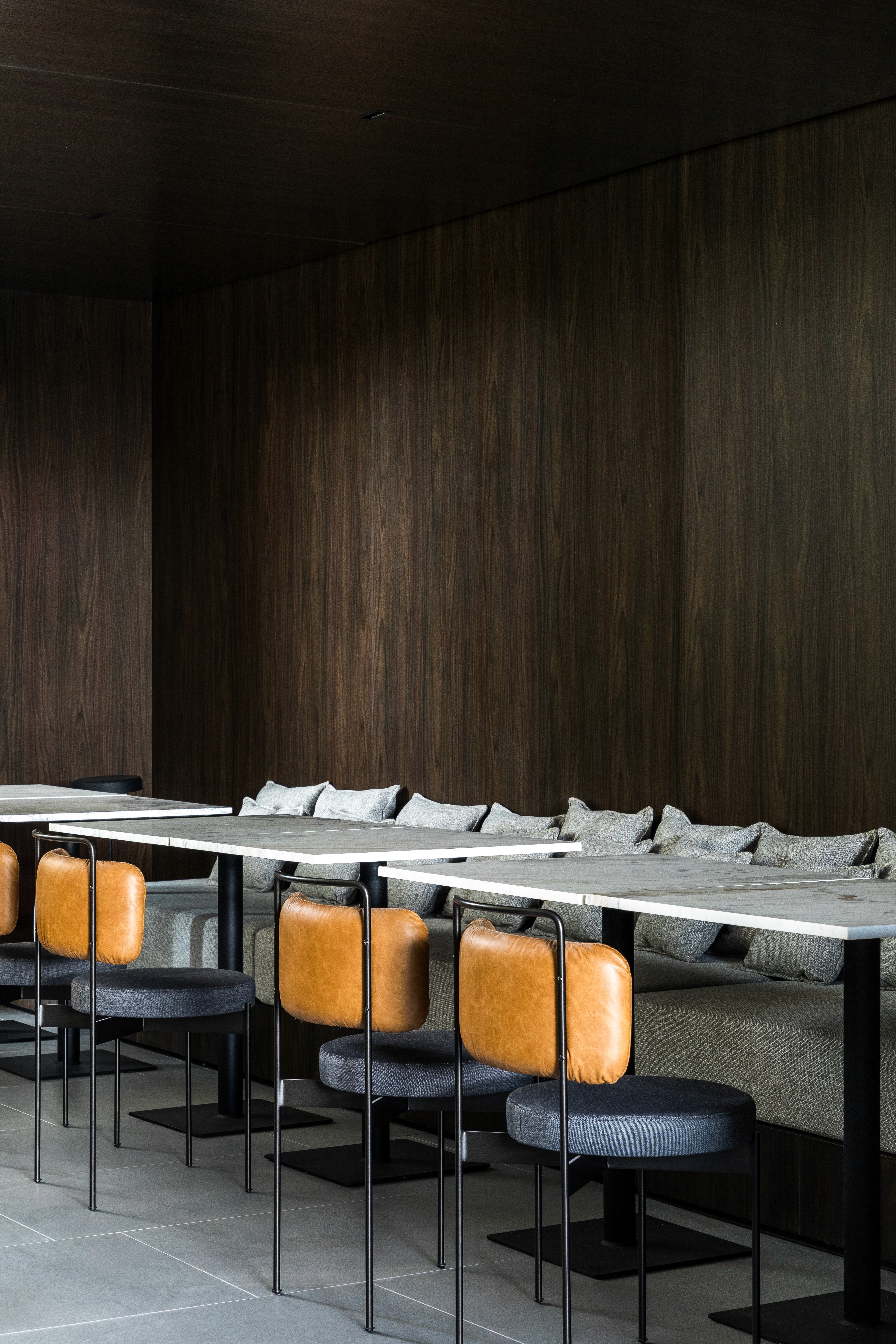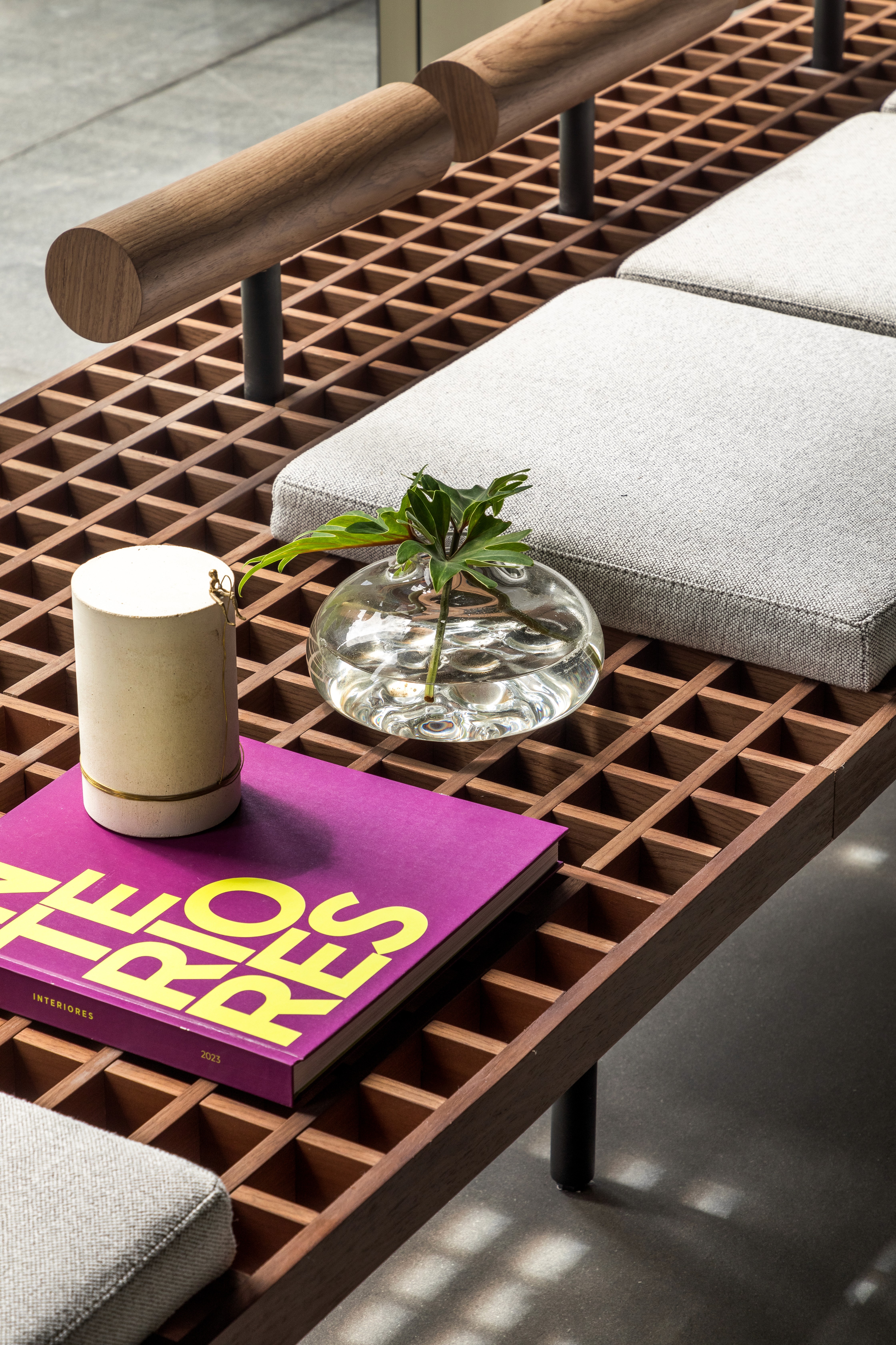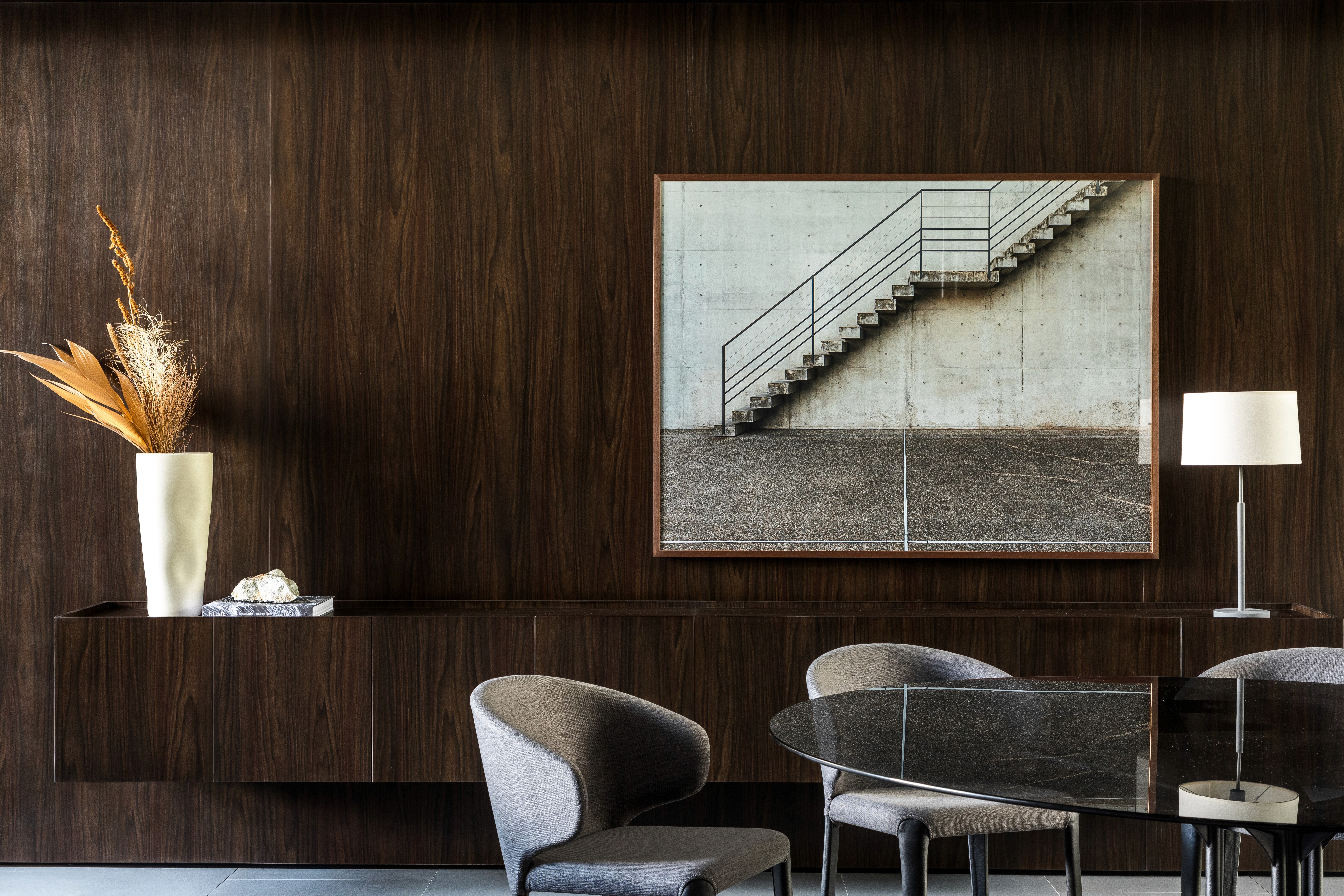 As áreas comuns do edifício FORMA traduzem sofisticação e modernidade por meio de uma composição equilibrada entre materiais brutos e elementos refinados. A estética contemporânea é marcada pelo concreto aparente, que contrasta com a madeira escura, criando uma atmosfera acolhedora e elegante. A paleta neutra, composta por tons de cinza, madeira escura e mármore, é complementada por texturas e linhas minimalistas. O hall do FORMA não é apenas um ponto de passagem, mas uma experiência visual e sensorial que reflete a identidade contemporânea do edifício, combinando funcionalidade, design e arte em perfeita harmonia. Logo no acesso de entrada, a grande obra da artista plástica Eleonora Gomes, quebra a sobriedade do concreto e adiciona um toque de cor e expressão ao espaço. O banco de estrutura vazada, desenhada pelo nosso escritório especialmente para este espaço, adiciona textura e personalidade ao ambiente. Complementando a composição, o projeto luminotécnico aposta em iluminação indireta e pontual, realçando texturas e volumes. As amplas áreas envidraçadas permitem a entrada abundante de luz natural, integrando o espaço interno ao paisagismo externo e proporcionando uma sensação de fluidez e leveza.