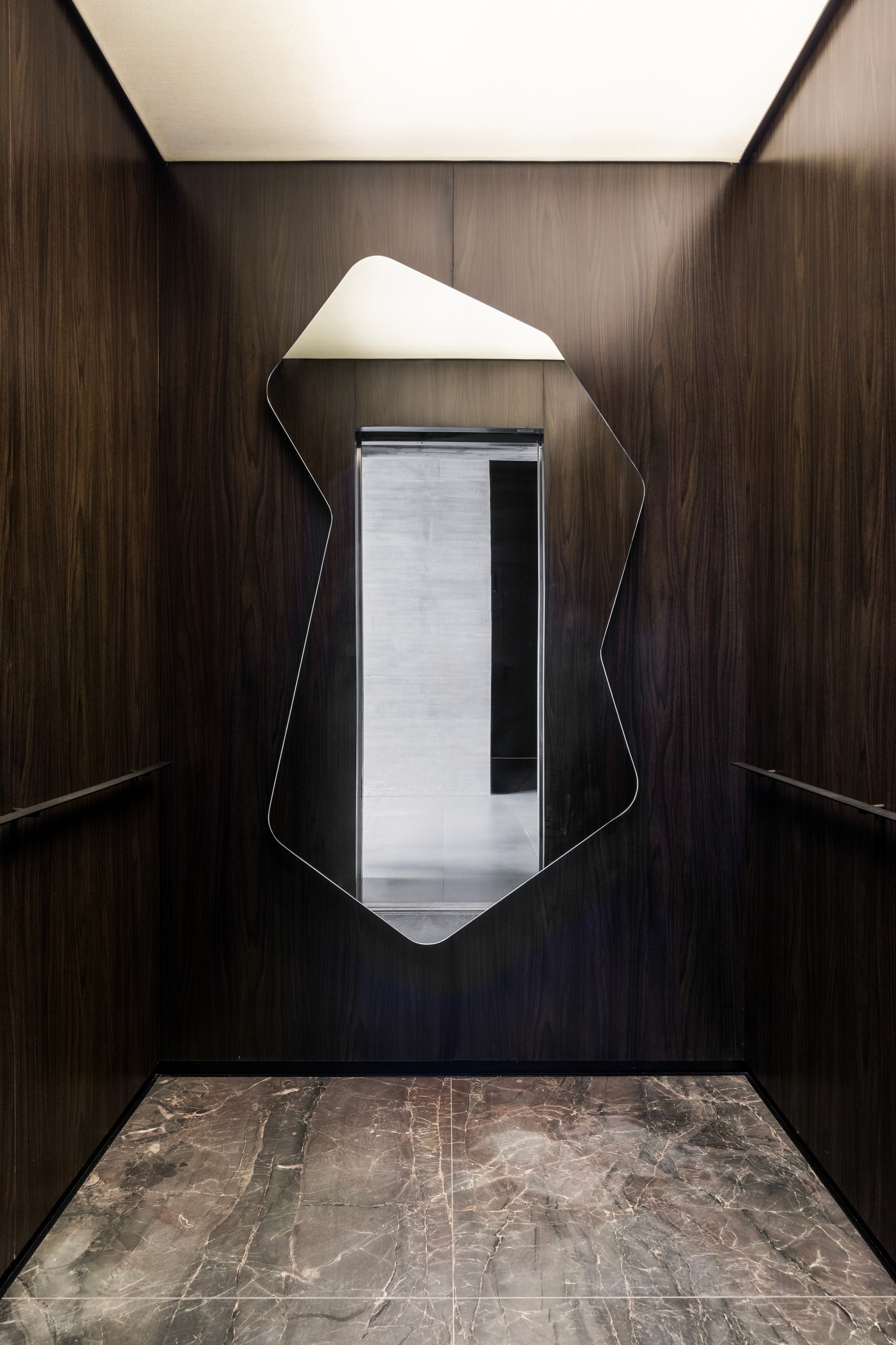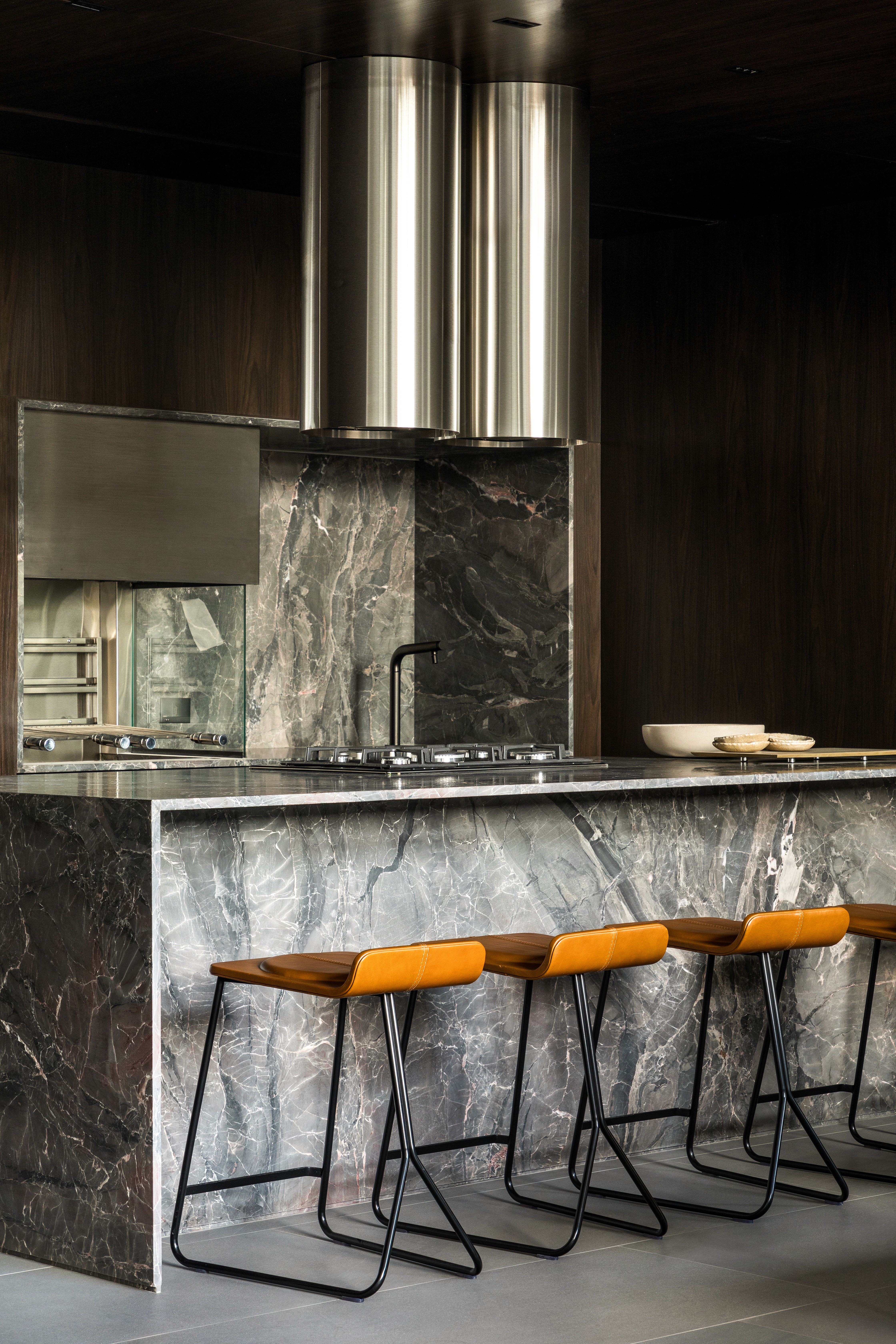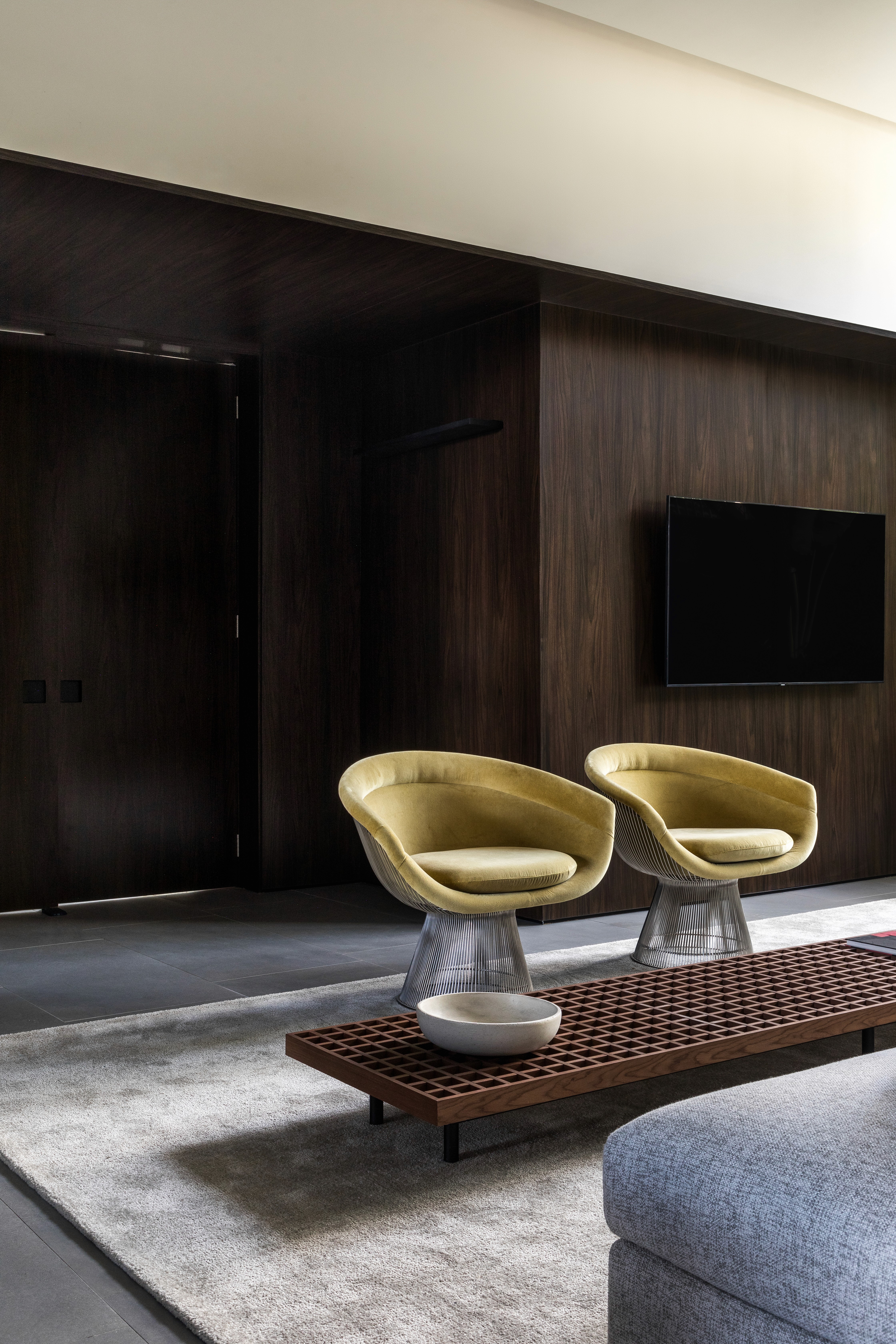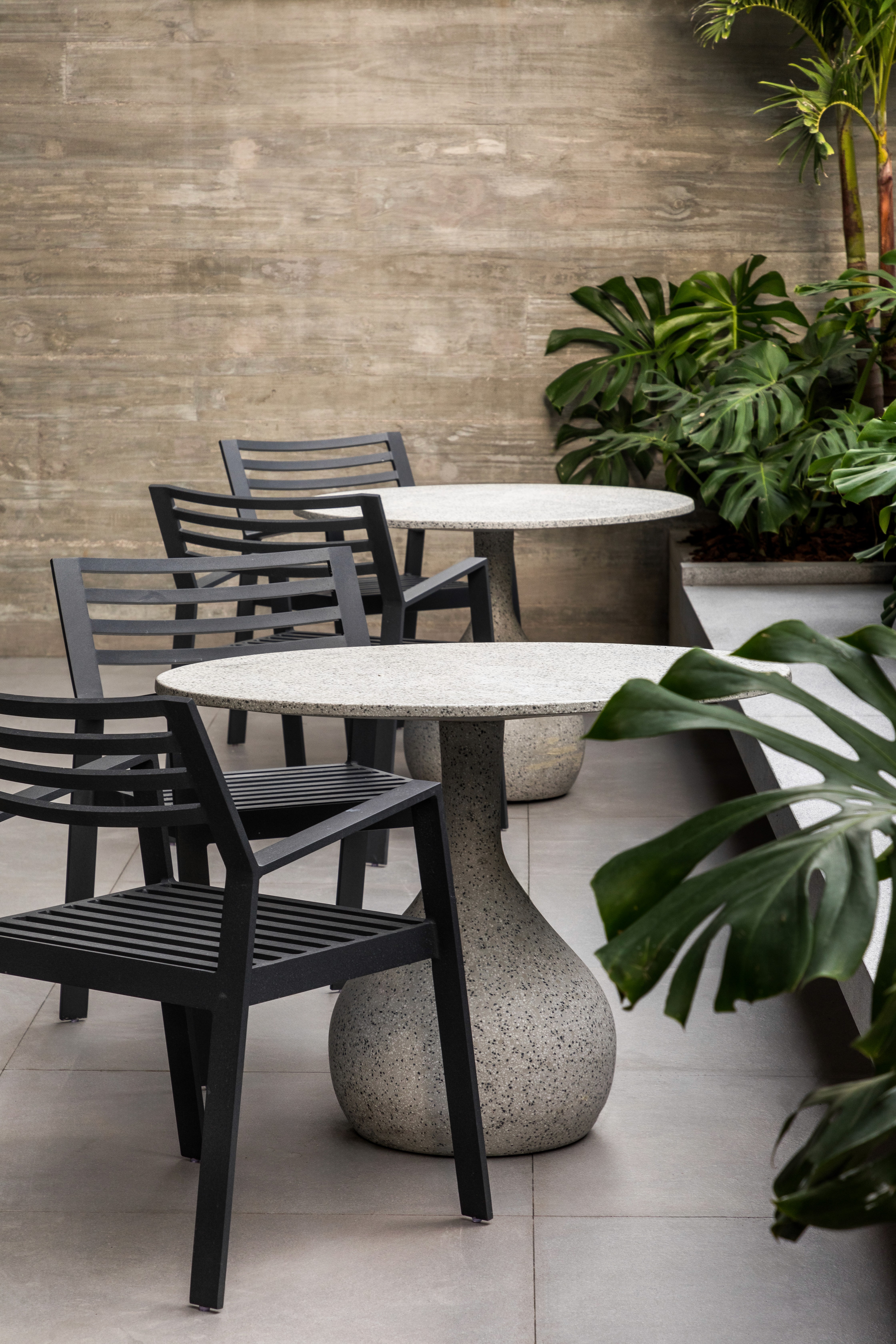 As áreas comuns do edifício FORMA traduzem sofisticação e modernidade por meio de uma composição equilibrada entre materiais brutos e elementos refinados. A estética contemporânea é marcada pelo concreto aparente, que contrasta com a madeira escura, criando uma atmosfera acolhedora e elegante. A paleta neutra, composta por tons de cinza, madeira escura e mármore, é complementada por texturas e linhas minimalistas. O hall do FORMA não é apenas um ponto de passagem, mas uma experiência visual e sensorial que reflete a identidade contemporânea do edifício, combinando funcionalidade, design e arte em perfeita harmonia. Logo no acesso de entrada, a grande obra da artista plástica Eleonora Gomes, quebra a sobriedade do concreto e adiciona um toque de cor e expressão ao espaço. O banco de estrutura vazada, desenhada pelo nosso escritório especialmente para este espaço, adiciona textura e personalidade ao ambiente. Complementando a composição, o projeto luminotécnico aposta em iluminação indireta e pontual, realçando texturas e volumes. As amplas áreas envidraçadas permitem a entrada abundante de luz natural, integrando o espaço interno ao paisagismo externo e proporcionando uma sensação de fluidez e leveza.